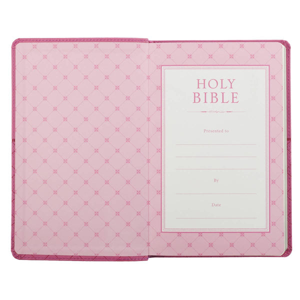 Take the classic King James text, a pretty pink cover, add just enough panache, and you are left with the Pink Faux Leather King James Version Gift Edition Bible—the complete Bible in an affordable binding that will make a meaningful gift on a special occasion. The pretty rosette pink cover is separated into two sections: the bottom half is decorated with a heat-debossed geometric diamond trellis design that wraps around the front and back covers, and the top is smooth pink faux leather. The title is displayed on the top half in silver foil, and the version reference is heat-debossed below it. HOLY BIBLEKING JAMES VERSION The spine design includes the heat-debossed title, version reference, and silver-foiled decorative spine ribs. Pretty silver gilded page edges protect the page edges from dust and moisture and add to the design's elegance. Topstitching around the edges of the cover adds strength an