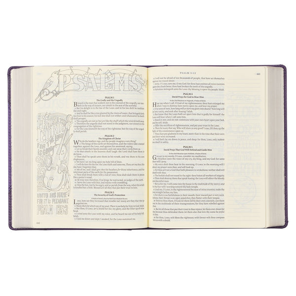 The Purple Faux Leather Hardcover KJV My Creative Bibleis a coloring and note-taking Bible that features a classic design in a modern color to complement the classic KJV text. The exquisite style is paired with an innovative Bible reading approach.