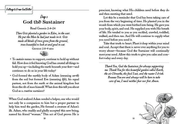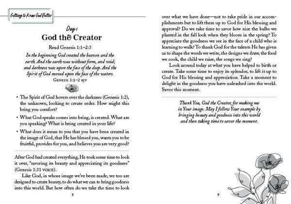 This fantastic book features three themed 30-Day Bible Reading Plans: Getting to Know God, Knowing Jesus Better, and Growing Your Faith. Each entry includes the scripture reference for the day’s Bible reading, questions for further thought, a devotional reading, and prayer starter—all to encourage you to apply God’s Word to your own life and heart.